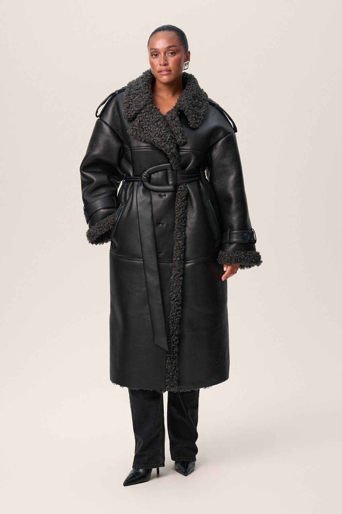 Manchester coat in black. The coat has a oversized fit, comes in midi length and is made of vegan leather with a faux shearling lining. It has welt pockets and a belt at waist with a D-shaped belt buckle.